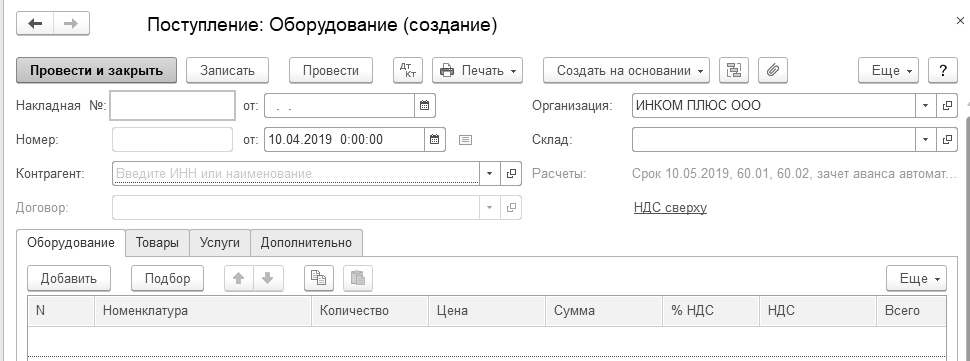 (меню "Панель разделов/ОС и НМА/Панель навигации/Поступление основных средств/Поступление оборудования")