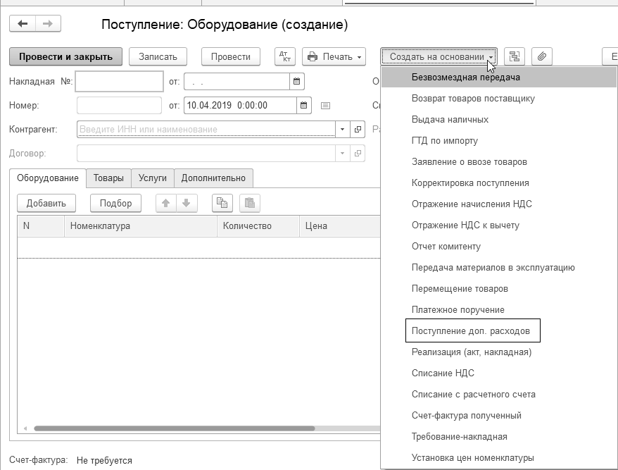 Документ "Поступление: Оборудование" можно использовать как основание для ввода других документов, в частности документа "Поступление доп. расходов". Чтобы ввести один документ на основании другого документа, следует обратиться к кнопке "Создать на основании", которая находится вверху формы данного документа (рис. 10.1.4).