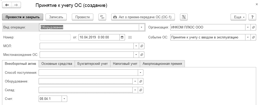 (меню "Панель разделов/ОС и НМА/Панель навигации/Поступление основных средств/Принятие к учету ОС")