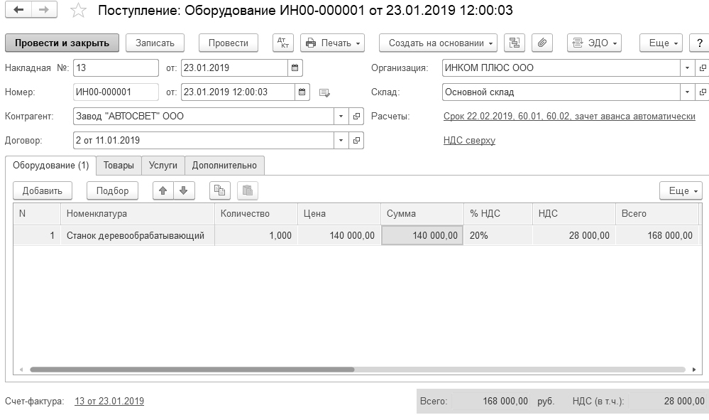 23.01.2019 года завод "Автосвет" предъявил накладную № 13 и счет-фактуру № 13 датой 23.01.2019 года на сумму 168 000 руб. за станок универсальный деревообрабатывающий СДУ-11. Цена станка 140 000 рублей (НДС 20% сверху).