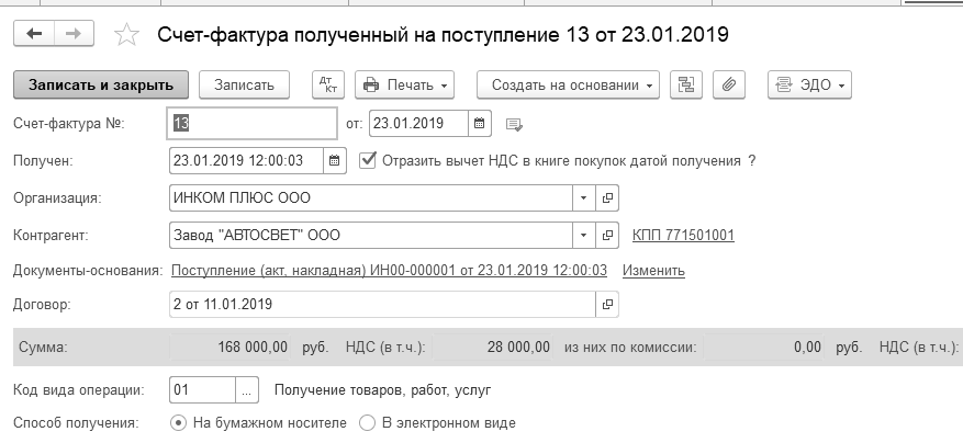 Рис. 10.1.7. Электронная форма окна документа "Счет-фактура, полученный на поступление"