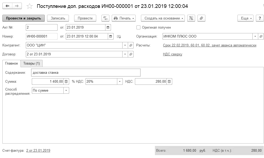 ООО "ЦИН" выставлен акт № 2 и счет-фактура № 2 от 23.01.2019 года на доставку станка. Договор № 2 от 23.01.2019 года, который действует до конца года. Цена доставки – 1 400 руб. (НДС 20% сверху). Оплата за доставку в сумме 1 680 рублей не произведена.