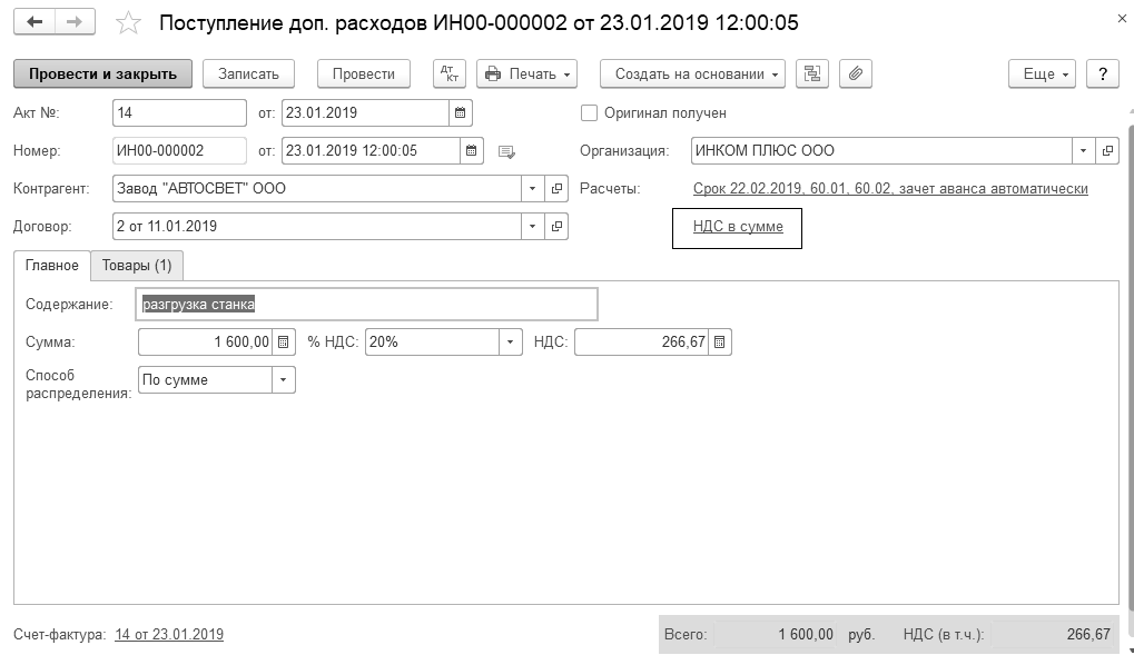 23.01.2019 года завод "Автосвет" представил акт № 14 и счет-фактуру № 14 за разгрузку станка. Основание – "Договор № 2". Сумма по акту 1 600 руб., НДС 20% в том числе.