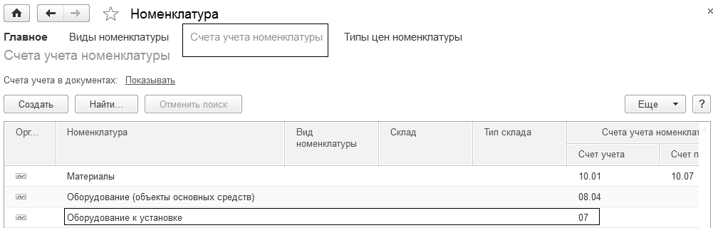 Для группы "Оборудование к установке" назначены счета бухгалтерского учета, которые представлены на рисунке 10.3.2.