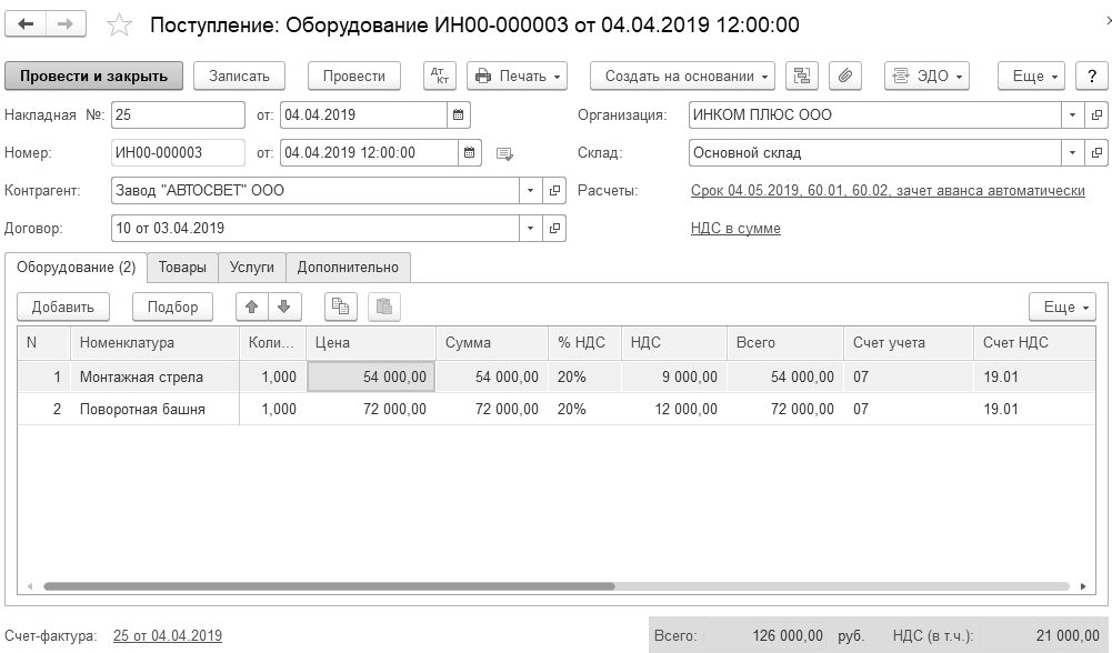 04.04.2019 года заводом "Автосвет" представлена накладная № 25 и счет-фактура № 25 за башенный кран по договору № 10 от 03.04.2019 г. на сумму 126 000 руб., в т. ч. НДС 20%.
