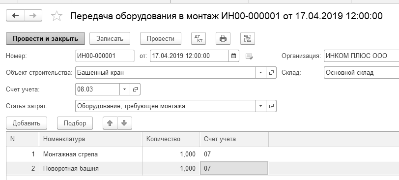Если организация получает основное средство, требующее монтажа, то необходимо заполнить документ "Передача оборудования в монтаж". В шапке документа указывается объект строительства, а в табличной части та номенклатура, которая увеличивает стоимость нашего объекта строительства. Кроме того, в шапке документа должен быть указан счет – 08.03 "Строительство объектов основных средств".