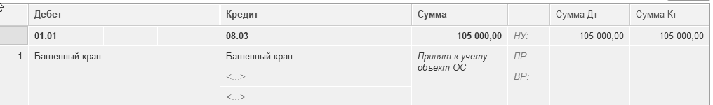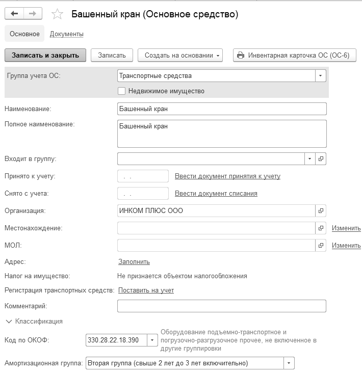 В табличной части основных средств заводим новый элемент "Башенный кран".