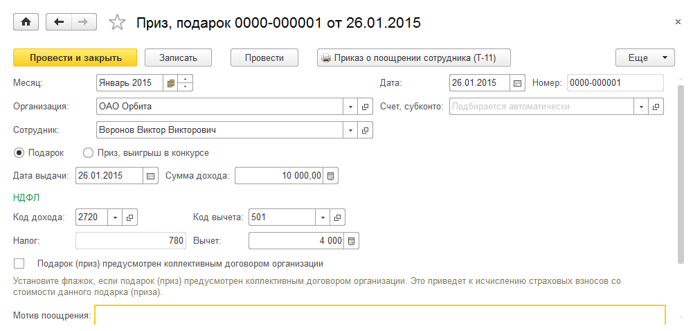 Для регистрации данных об учете в программе сумм выданных работнику в натуральной форме призов и подарков используется документ Призы, подарки