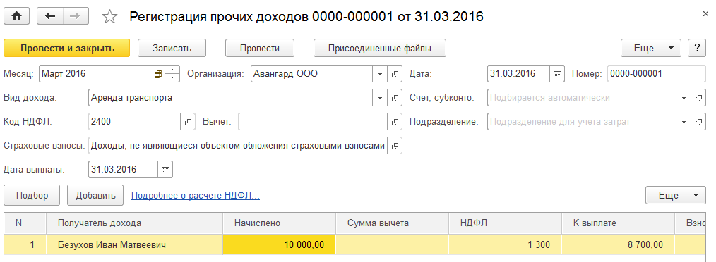 Физическому лицу Безухову И.М., не состоящему в трудовых отношениях с ООО "Авангард", начислен 31.03.2016 доход в виде аренды автотранспорта в размере 10 000 руб. Такое физическое лицо уже есть в учебной базе, необходимо зарегистрировать незарплатный доход, создав документ "Регистрация прочих доходов" из раздела "Выплаты/ Незарплатные доходы".