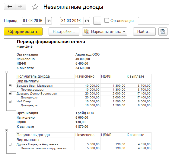 Также в разделе "Выплаты / Отчеты по выплатам" можно сформировать отчет по незарплатным доходам.