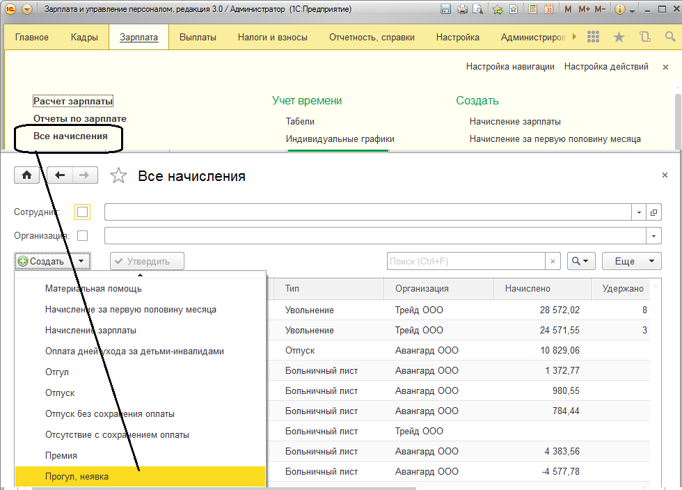 Документ "Прогул, неявка" предназначен для регистрации периодов без оплаты, таких как отсутствие сотрудника без подтверждающих документов, прогул.