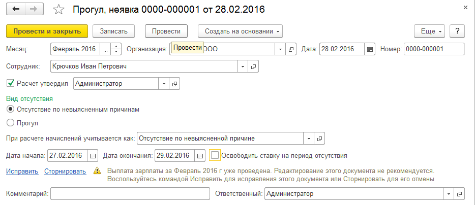 Сотрудник ООО "Авангард" Крючков И.П. с 27.02.16 заболел, однако документов пока в организацию не предоставлено. Зафиксируем пока отсутствие по невыясненной причине. Для этого из раздела "Зарплата/ Все начисления" создадим документ "Прогул, неявка" и заполним его следующим образом. Проведем документ.