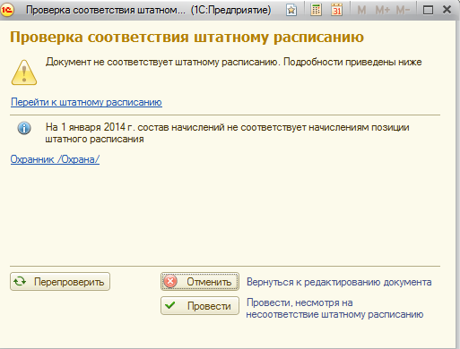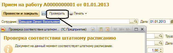 В кадровых приказах по движению сотрудников существует возможность выполнить проверку на соответствие приказа штатному расписанию по команде "Проверить".