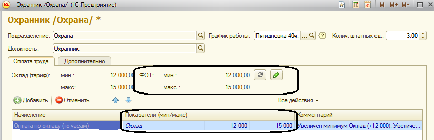 В крупных компаниях при составлении штатного расписанию зачастую используется "вилка" окладов (например, при приеме на работу сотрудников на определенную должность всем гарантирована минимальная ставка по должности, но с учетом коэффициентов за стаж работы, наличие нескольких образований и тому подобных характеристик, минимальный размер может быть больше). Если данная ситуация нормативно обоснована, то в программе можно включить такую возможность в настройках кадрового учета программы.