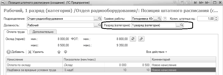 При установке в настройках кадрового учета программы флажка "В позиции штатного расписания используются разряды и категории", будет доступна возможность уточнять разрядом (категорией) позицию дополнительно к должности. Возможность выбирается в настройках кадрового учета (штатного расписания). Тогда не придется заводить должности, например "Слесарь 6 разряда", "Слесарь 5 разряда", а нужно будет завести только одну – "Токарь" и уточнить разряды при описании позиций.