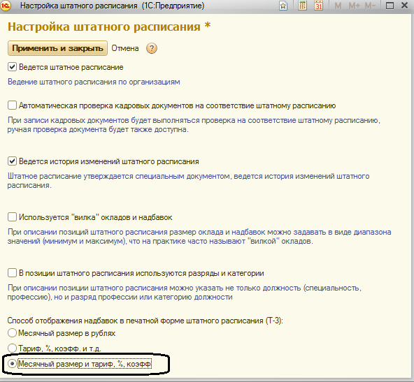1. Установим в настройках кадрового учета программы переключатель отображения на позицию "Месячный размер и тариф ,%, коэфф.":