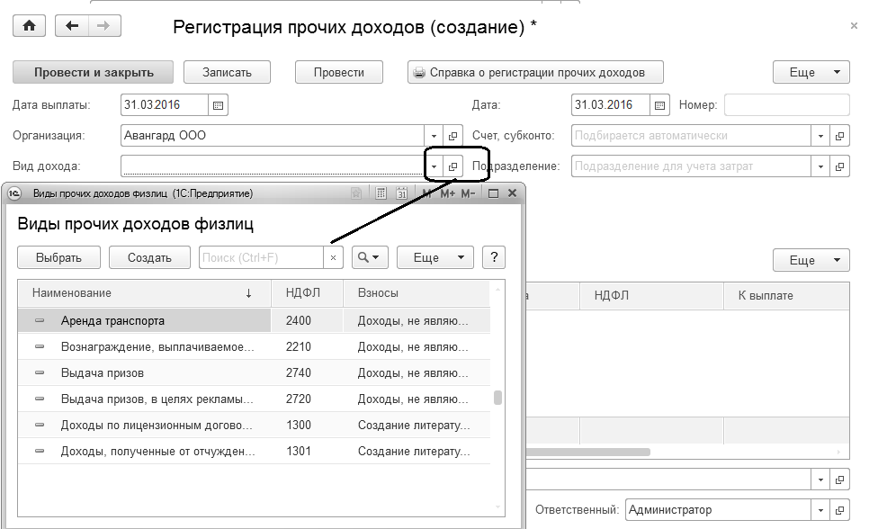 Вид дохода выбирается из справочника "Виды прочих доходов физических лиц", также доступном в разделе "Выплаты".