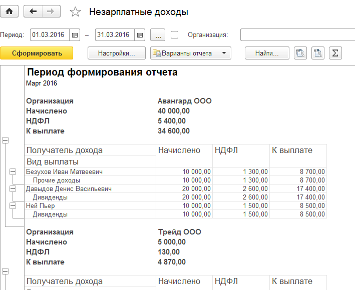 Также в разделе "Выплаты / Отчеты по выплатам" можно сформировать отчет по незарплатным доходам.