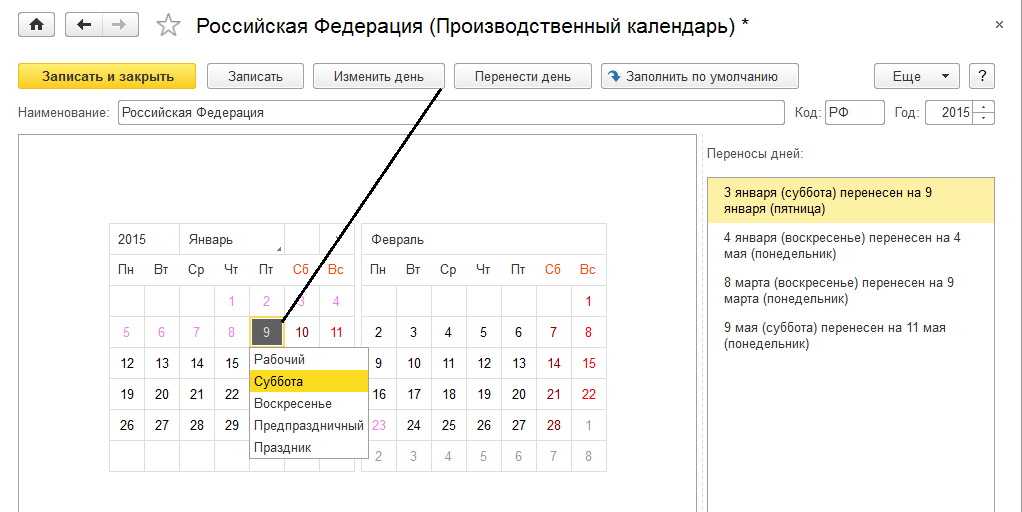 Если нажать на кнопку "Заполнить по умолчанию", то федеральный регламентированный календарь заполнить с учетом переносов праздничных дней на текущий год.