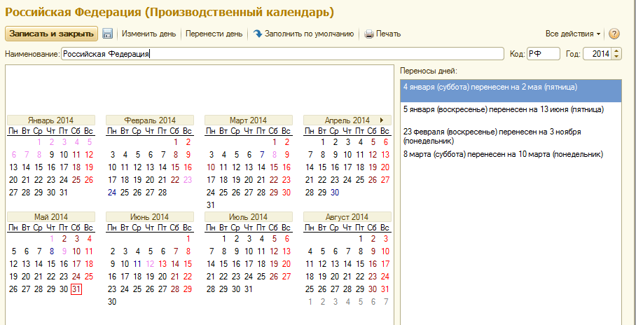 1.Откроем производственный календарь "Российская Федерация" и проверим его заполнение на 2014 год.