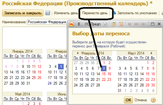 • Перенести день – выполнить перенос рабочего дня на выходной либо наоборот. В этом случае в открывшемся окне следует выбрать дату, на которую осуществляется перенос.