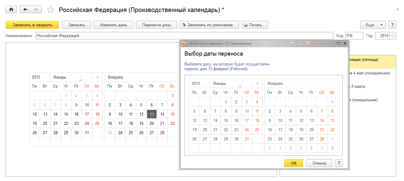 Если в последующем потребуется перенести выходной день, совпадающий с праздничным, то для этого нужно выделить в календаре выходной день, который нужно перенести, нажатием правой кнопки мыши вызвать контекстное меню или выбрать пункт Перенести день. В появившемся диалоговом окне указать дату, на которую следует перенести выходной день.