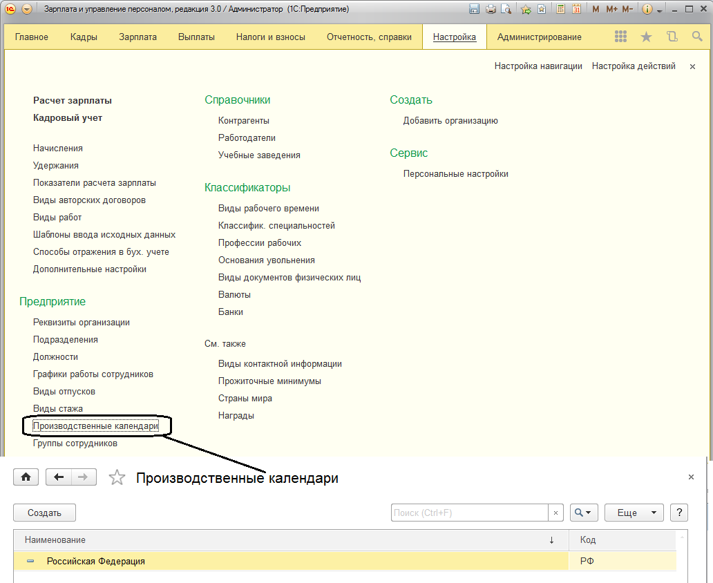 Доступ к производственным календарям осуществляется из раздела "Настройка".