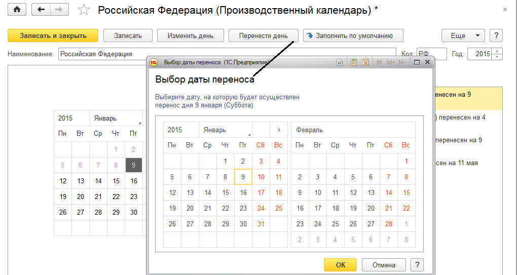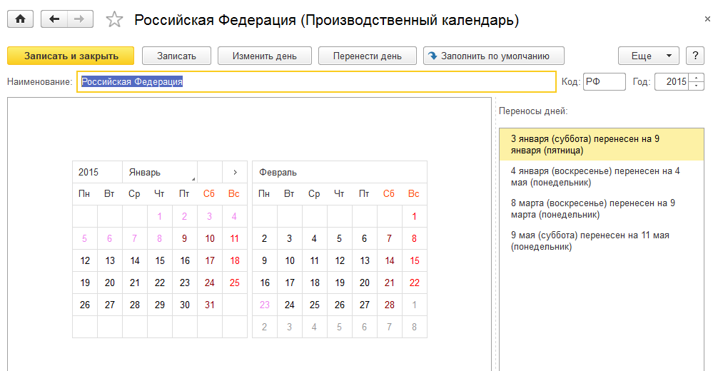 Если нажать на кнопку "Заполнить по умолчанию", то федеральный регламентированный календарь заполнить с учетом переносов праздничных дней на текущий год.