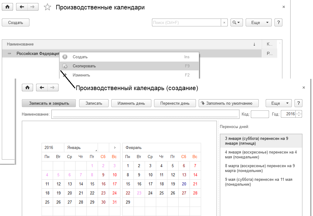 2*. Создадим новый производственный календарь "Региональный производственный календарь", копированием с основного производственного календаря по РФ (код РСЯ).