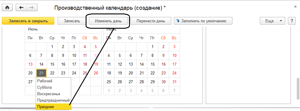Стрелками перейдем к месяцу "июнь". Назначим 21 июня региональным праздником по команде "Изменить день – Праздник".