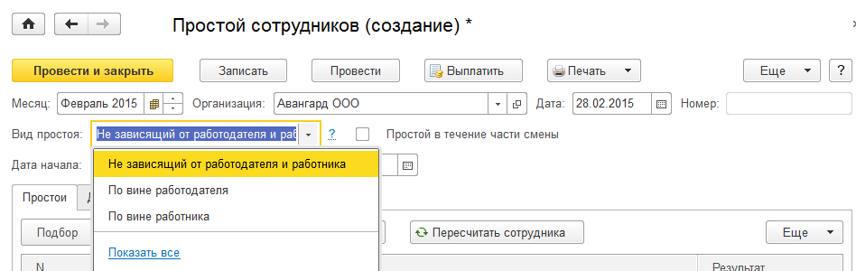 Простои могут быть оплачиваемые и неоплачиваемые. В программе существует возможность регистрировать любой вид простои документом "Простои сотрудников", если выбрана соответствующая возможность в настройках программы.