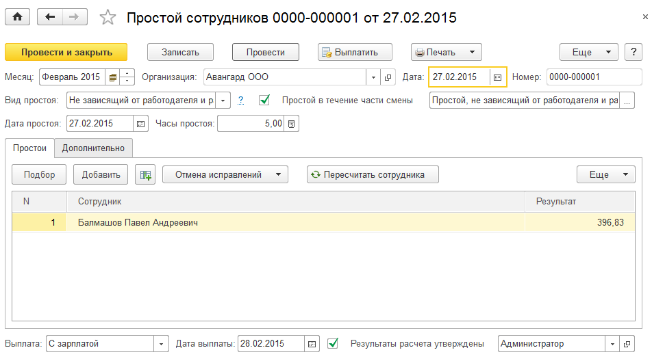 Сотруднику ООО «Авангард» Балмашову П.А. оформлен простой, по причинам, не зависящим от работодателя и работника, на 27.02.2015 на 5 часов. Отразим ситуацию в программе. Для этого из раздела «Зарплата/ Все начисления» создадим документ «Простой» и заполним его следующим образом: