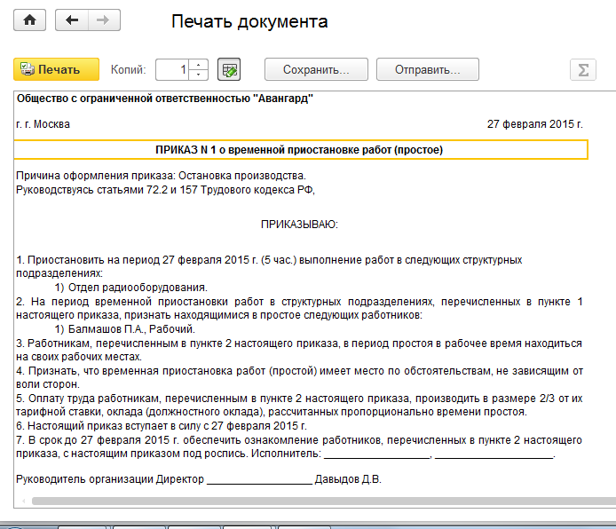Расчет производится автоматически. Проведем документ. Выведем на печать приказ о временной приостановке работ.