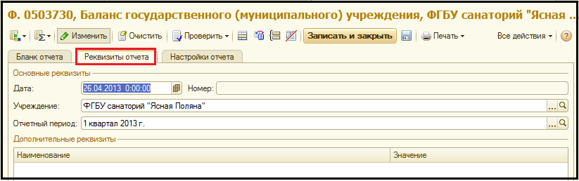 На закладке Реквизиты отчета настраиваются основные параметры экземпляра отчета: