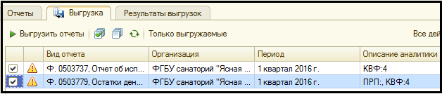 Чтобы сформировать файлы выгрузки, необходимо отметить в списке документы, которые должны войти в состав выгрузки, и нажать кнопку "Выгрузить отчеты"