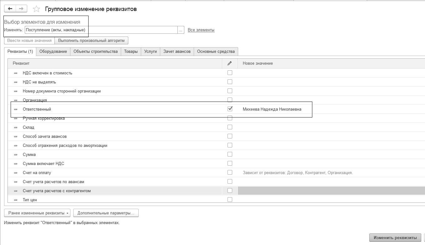 Изменим ответственное лицо во всех документах "Поступление (акты, накладные)" с Администратора на Михееву Н.Н. (рис. 27.2). Обратите внимание, что пользователя надо создать в разделе 28.