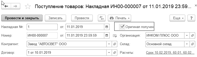 В формах документов "Поступление (акты, накладные)" можно установить флаг "Оригинал получен", если от поставщика получены входящие документы (оригиналы). Этот реквизит находится в верхней части формы документа (рис.
