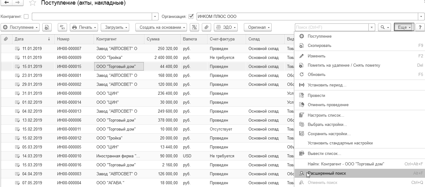 В журнале документов "Поступление (акты, накладные)" можно сформировать список только по одному контрагенту, или по нескольким. Для это применяется команда "Еще/Расширенный поиск". В первом случае, лучше сразу остановиться на любом документе нужного контрагента и после обратиться к поиску (рис. 27.6).
