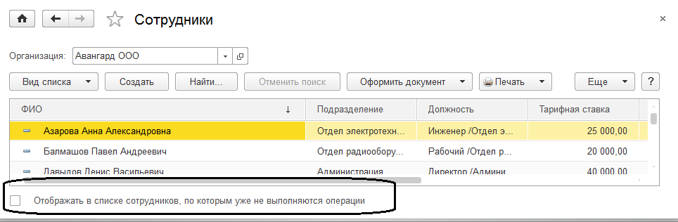 Также сотрудников можно отнести к архивным, установив соответствующий флажок в нижней части формы. Чтобы отобразить карточки таких сотрудников, в списке сотрудников устанавливается флаг "Отображать в списке сотрудников, по которым уже не выполняются операции".
