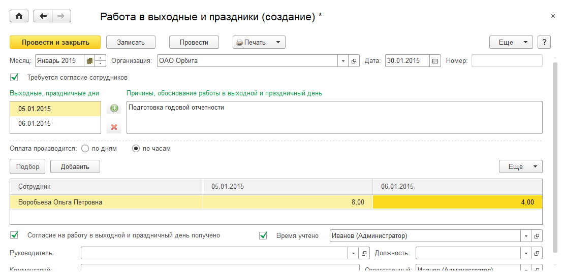 В связи с необходимостью подготовки годовой отчетности, бухгалтер Воробьева Ольга Петровна работала 5января - 8 часов и 6 января 4 часа.. Необходимо зарегистрировать работы в программе.