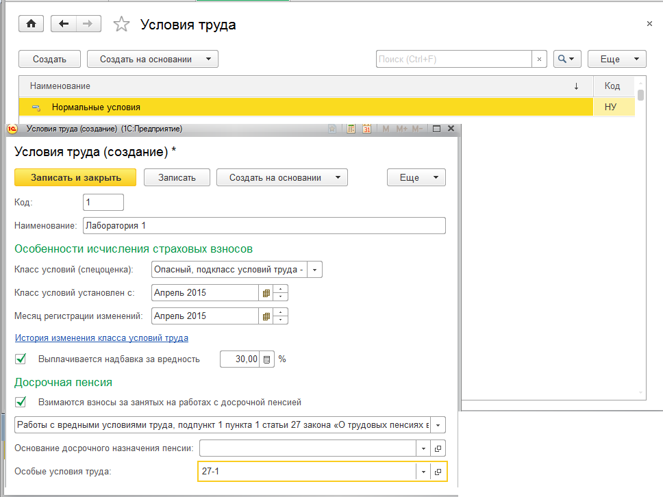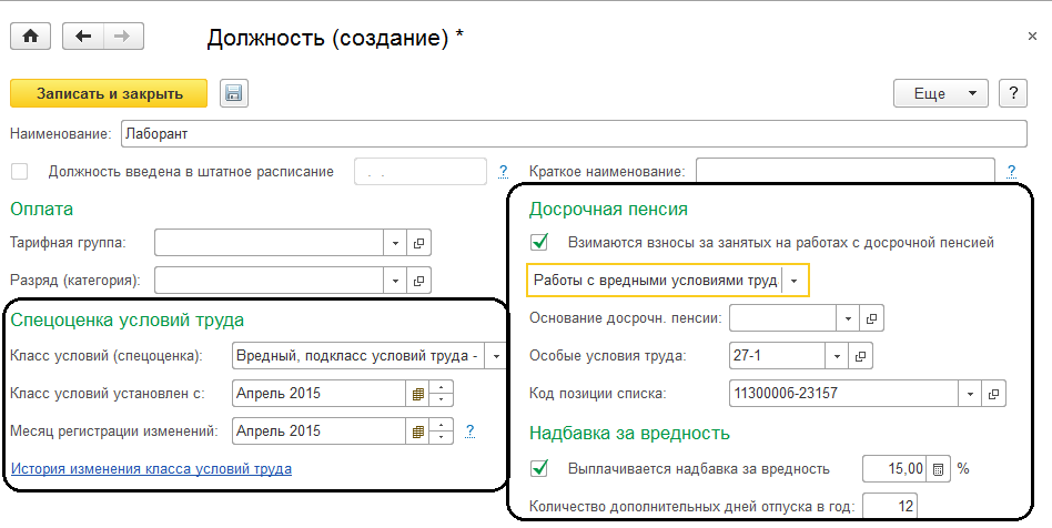 2. В справочнике «Должности» те должности, которые предполагают работу во вредных условиях, создаются отдельно. Для каждой должности указываются соответствующие коды для стажа ПФР.