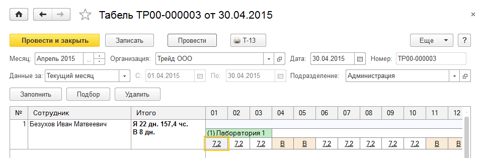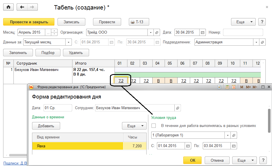 5.3. Время работы в разных условиях труда фиксируется в табеле учета рабочего времени. Редактирование времени в табеле производится в отдельной форме, которая открывается по щелчку в ячейке. При этом имеется возможность регистрировать работу на разных территориях или в разных условиях работ в течение одного дня.