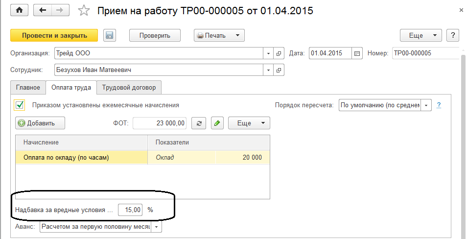 Надбавка за вредность учитывается по должности и может быть скорректирована вручную.