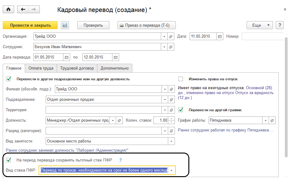5. При работе во вредных условиях могут рассчитываться страховые взносы по дополнительному тарифу (в зависимости от класса условий, если применяется спецоценка). Кроме того, работа в таких условиях отражается в стаже ПФР по указанным в должности кодам. При временном кадровом переводе можно сохранить за сотрудником право на льготы во вредных условиях.