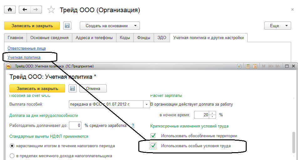 1. В организации может быть предусмотрена работа во вредных/тяжелых условиях. В учетной политике организации в таком случае следует указать соответствующие настройки.