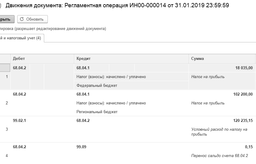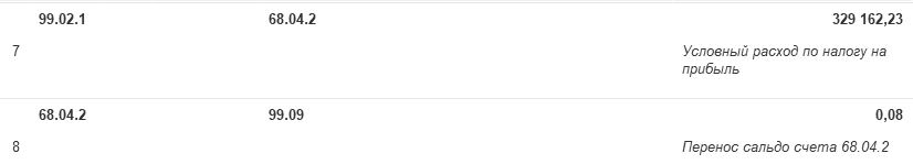 С 2014 года при выполнении регламентной операции "Расчет налога на прибыль" сальдо счета 68.04.2 "Расчет налога на прибыль" переносится на счет 99.09 "Прочие прибыли и убытки".