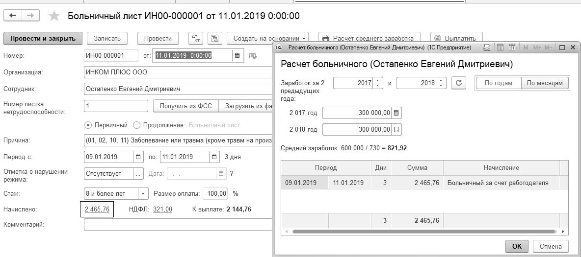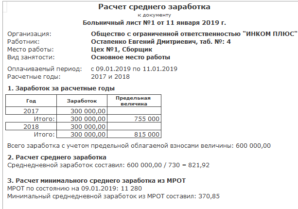 Цель: рассчитать сумму пособия по больничному листу. Оформить документ "Больничный лист" на дату 11.01.2019 года. Работнику следует рассчитать пособие по временной нетрудоспособности в размере 100% среднего заработка. Остапенко ежемесячно получал 25 000 руб. Расчетный период включает 2017 и 2018 гг.