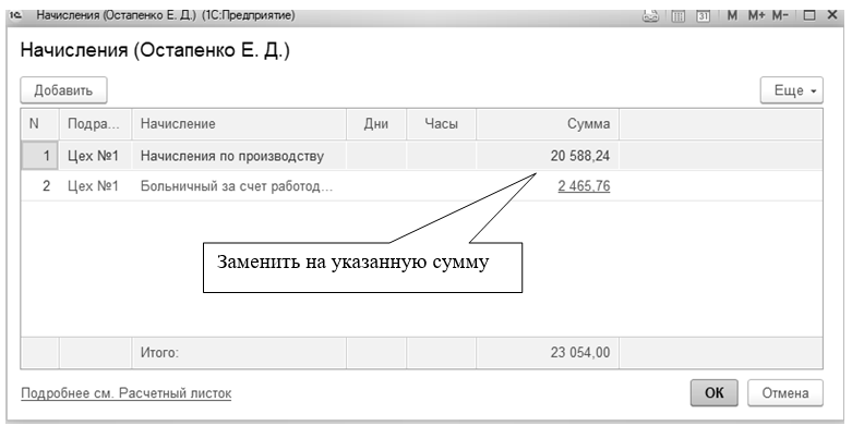 Откорректируйте сумму начисленной зарплаты Остапенко на закладке "Начисления".