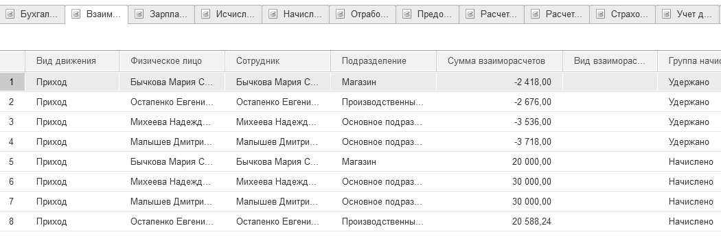 Рис. 9.1.14. Регистр накопления "Взаиморасчеты с сотрудниками"