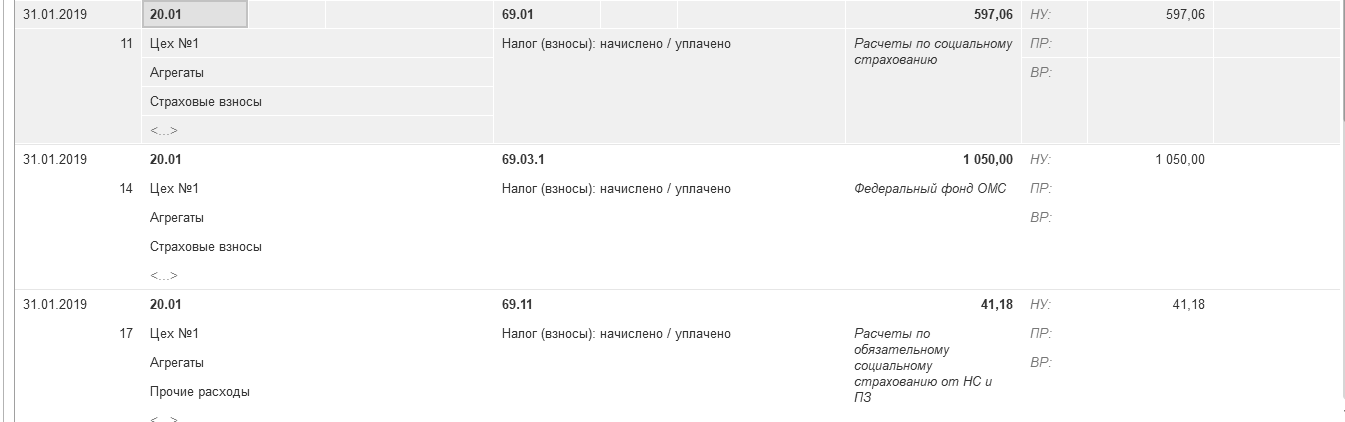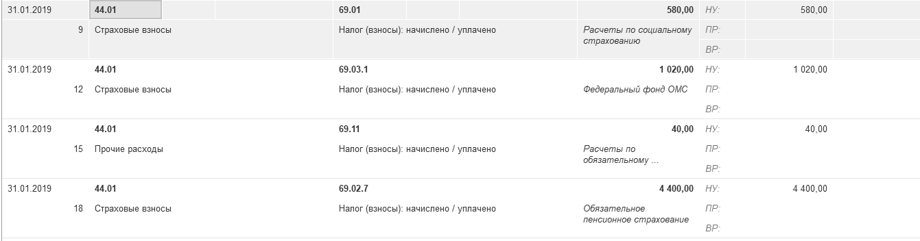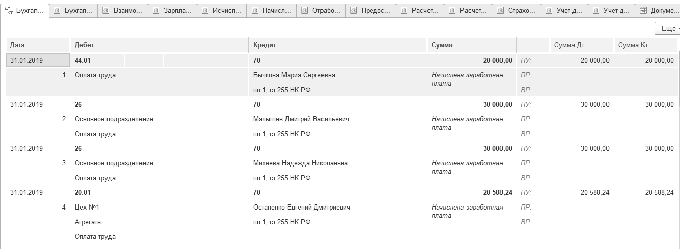 Проведенный документ создаст проводки по начислению зарплаты (например, Д 26 К70), проводки по начислению НДФЛ (например, Д 70 К 68.01) и проводки по начислению страховых взносов. Проводки формируются сводные (виды начислений суммируются).
